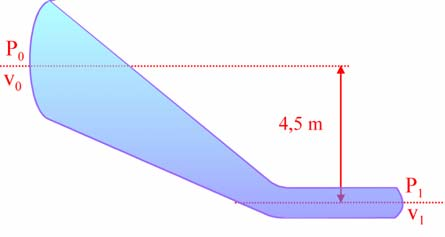 PREGUNTA: Un líquido fluye de izquierda a derecha por un tubo cilindrico. La densidad de la sustancia es \(1,5\ kg/m^3\) . Su velocidad en el extremo de entrada es \(v_0\ =\ 2\ m/s\), y la presión allí es de \(1,5\ Pa\) y el radio de la sección es \(r_0\ =\ 10\ cm\). El extremo de salida está a \(4,5\ m\) abajo del extremo de entrada y el radio de la sección allí es \(r_1\ =\ 8\ cm\). Encontrar la presión \(P_1\) en este extremo del tubo?. Nota: para este ejercicio se utiliza la ecuación de continuidad, \(S_2\ v_2\ =\ S_1\ v_1\) , donde \(S\ =\ \pi\ r^2\) . Considere \(g\ =\ 9,8\ m/s^2\).