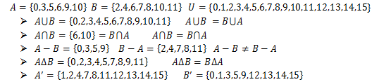 Ejemplo 1: dados los conjuntos A, B y U realizar todas las operaciones dados anteriormente.