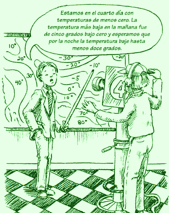 El meteorólogo informó sobre el tiempo en la figura anterior usando números negativos, para indicar cuánto frío hacía, pues la temperatura estaba por debajo de cero grados. Cuando tú aprendiste a contar por primera vez, contabas con números positivos, es decir con número mayores a cero: 1,2,3,4, etc. Por eso es que esos números se llaman números contables. Pues bien, también hay números negativos, se usan para expresar temperaturas frías, el dinero que uno debe a otros, los metros bajo el nivel del mar, y muchas otras cosas.