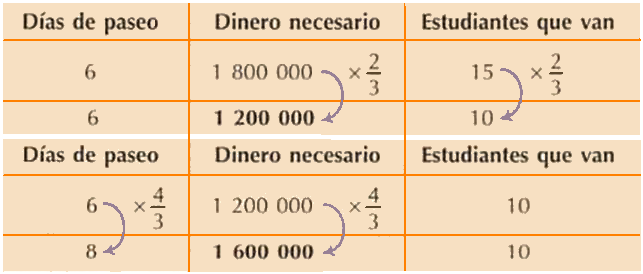 EJEMPLO1: Quince compañeros, estudiantes de grado séptimo, planean un paseo de \(6\) días. Realizado el presupuesto de gastos, estos ascienden a \( $1\ 800\ 000\). Cinco de los compañeros deciden no ir y los restantes acuerdan alargar el paseo \(2\) días más. ¿De cuánto dinero deben disponer para que las condiciones del paseo planeado se conserven?
