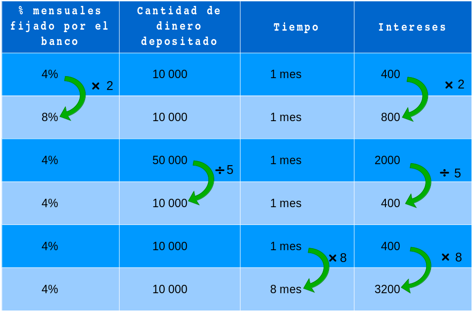 →Ahora calculemos cuánto recibe de interés en \(5\) meses, si deposita \( $10\ 000\) y el banco fija un porcentaje de \(4\ %\).
