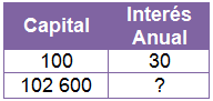 →\( $100\) generan un interés anual de \( $30\); deseamos saber qué interés anual produce un capital de \( $102\ 600\).