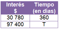 Como el interés percibido es directamente proporcional al tiempo y se sabe que \( $30\ 780\) es el interés anual, entonces \(T = 1139,18\) días.