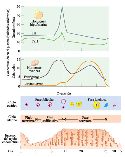 Durante la primera mitad del ciclo menstrual, los niveles de estrógeno crecen y hacen que el recubrimiento del útero crezca y se ensanche. Como resultado de la hormona foliculoestimulante, un óvulo empieza a madurar en uno de los ovarios. Alrededor del día 14 de un ciclo típico de 28 días, un aumento en la hormona luteinizante hace que el óvulo abandone el ovario. A esto se le llama ovulación.
