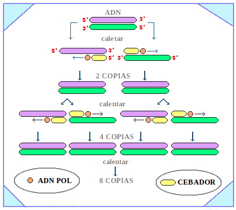En 1988 estuvo disponible un nuevo método la reacción en cadena de la polimerasa (PCR), ideada en 1983 por Kary Mullis. Éste permite mecánicamente, la amplificación de genes en grandes cantidades a partir de muy poco ADN. El sistema implica la adición de un cebador corto (un oligonucleótido) en cada extremo de la secuencia elegida de ADN, separando las dos cadenas de la doble hélice por calentamiento y exponiéndolas a un ADN polimerasa que reconoce a los cebadores dispuestos a cierta distancia entre sí en lados opuestos de la cadena y duplica el número de cadenas de ADN en la muestra. Esta enzima es obtenido a partir de una purificación de una bacteria que prospera en las elevadas temperaturas de las aguas termales y que no se desnaturaliza por temperatura cuando el ADN seleccionado lo es. De este modo en la PCR, ambas cadenas de ADN se copian simultáneamente y si el procedimiento se repite unas veinte veces, se obtendrán un millón de copias a partir de un solo fragmento original.