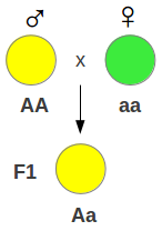 Explicación de los resultados: El polen de la planta progenitora aporta a la descendencia un alelo o gen para el color de la semilla, y el óvulo de la otra planta progenitora aporta el otro alelo para el color de la semilla; de los dos alelos, solamente se manifiesta aquél que es dominante (A), mientras que el recesivo (a) permanece oculto.