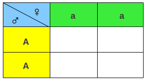 En la primera fila (celdas verdes) se colocan los alelos o genes que aportará la madre a los gametos. De igual manera se cumple la ley de la segregación. Entonces en cada celda se coloca un solo gen (a).