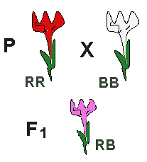 La primera ley de Mendel se cumple también para el caso en que un determinado gen dé lugar a una herencia intermedia y no dominante, como es el caso del color de las flores del "dondiego de noche". Al cruzar las plantas de la variedad de flor blanca con plantas de la variedad de flor roja, se obtienen plantas de flores rosas, como se puede observar a continuación: