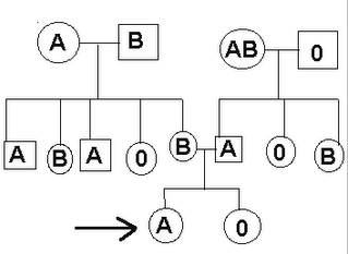 PREGUNTA: En la familia de la ilustración se indican los grupos sanguíneos de cada individuo, donde el alelo A y el alelo B son dominantes y el alelo O es recesivo. Uno de los miembros de la genealogía tiene un grupo sanguíneo no explicable en base al tipo de herencia del carácter. Indicar de qué persona se trata.