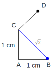 Al unir lo puntos B y D obtenemos el triángulo rectángulo BCD, cuyos catetos son los segmentos CD y DC de longitudes 1 y \)sqrt{2}\(, respectivamente. La longitud de la hipotenusa (el segmento DB) es \)sqrt{3}$$; este se determina por el teorema de Pitágoras.