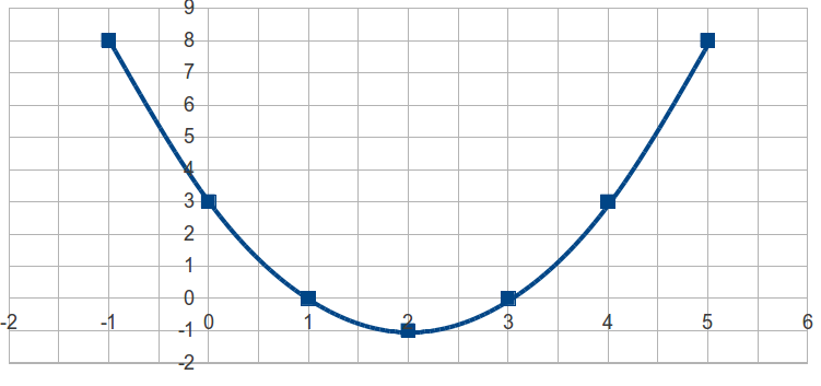 El único valor de \(x\) que no tiene otro valor de el mismo valor para y es \(x\ =\ 2\). Además como \((x-2)^{2} \geq 0\). Para todo valor de \(x\), entonces \((x-2)^{2} \ -\ 1\geq-1\).Eso significa que el valor mínimo para \(y -1\), que se obtiene cuando \(x\ =\ 2\).