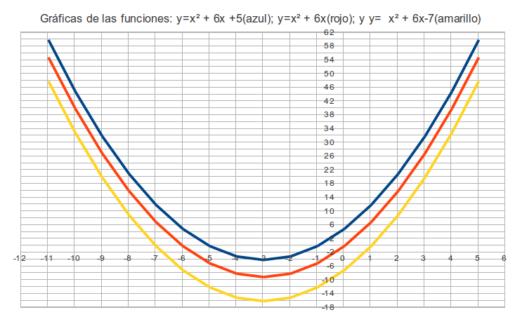 Si representamos las gráficas de las ecuaciones \(y=x^{2}+6x+5\);\(y=x^{2}+6x\); y \(y=x^{2}+6x-7\):