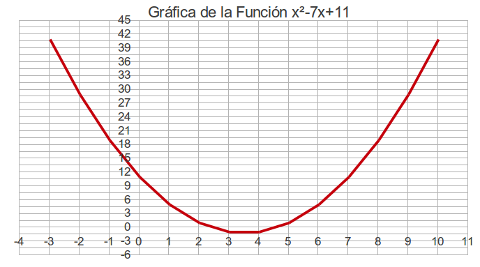 – Con el eje x: si \(y=0\), entonces \(x^{2}-7x+11=0\).