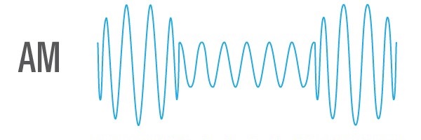 Las ondas de radio pueden ser de amplitud modulada (AM) en cuyo caso las frecuencias están entre \(530\ kHz\) y \(1600\ kHz\). A cada estación emisora se le asigna un margen para poder sintonizarla en valores cercanos a la frecuencia que le corresponde, a este margen se le llama ancho de banda. En el caso de AM el ancho de banda es \(10\ kHz\). La señal se imprime en una onda portadora y ésta varía la amplitud con las variaciones de la señal.