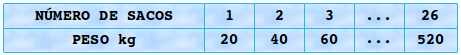 Observa que; 1/20=2/40=3/60=... Las magnitudes número de sacos y peso en kg son directamente proporcionales.