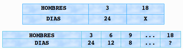Ejemplo: Si \(3\) hombres necesitan \(24\) días para hacer un trabajo, ¿cuántos días emplearán \(18\) hombres para realizar el mismo trabajo?