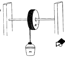 PREGUNTA: Una cubeta de agua de masa m = 22 [Kg] atada a una cuerda de masa despreciable, la cual está enrollada a una polea cilíndrica (I = 1⁄2 MR2) de masa M = 36 [Kg] y radio R = 0.25 [m]. La polea puede girar libremente respecto al eje horizontal mostrado en la figura. Si inicialmente la cubeta está en reposo y se suelta, de manera que la polea comienza a girar. a) Por dinámica, calcula la velocidad de la cubeta 5 [seg] después de haberla dejado libre.