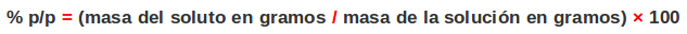 Porcentaje peso a peso (% p/p): Representa el número de gramos de soluto presentes en 100 g de solución. Se expresa con la notación % (p/p).