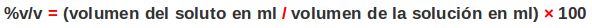 Porcentaje volumen a volumen (% v/v): Indica cuantos mililitros de soluto estan presentes en 100 ml de solución. Se expresa con la notación % (v/v).
