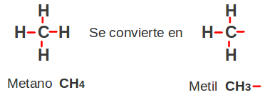 Cuando alguno de los alcanos pierde un átomo de hidrógeno se forma un radical alquilo o grupo alquílico. Estos radicales aparecen como ramificaciones sustituyendo átomos de hidrógeno en las cadenas de carbono.