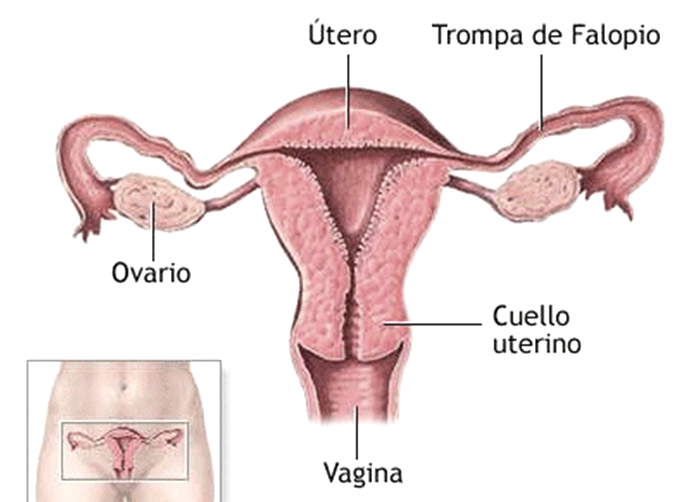El útero, también conocido como matriz, es un órgano muscular hueco con forma de pera invertida, de pared gruesa y elástica, situado detrás de la vejiga y delante del recto, que mide de siete a ocho centímetros de longitud y tres de ancho. Alcanza el tamaño adulto a los 15 años, se expande mucho durante el embarazo y se reduce después de la menopausia. La parte angosta y alargada del útero, denominada cuello o cérvix, se conecta con la vagina. El resto del órgano es más ancho y se denomina cuerpo, cuya cavidad esta revestida por un tejido mucoso el endometrio. La función de este órgano es nutrir y albergar al feto durante el embarazo si el ovulo fue fecundado. Cuando no hay fecundación, el ovulo es evacuado por la vagina al exterior, y el endometrio se desprende de la pared uterina en forma de sangrado, conocido como menstruación.