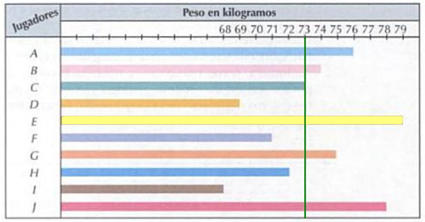Vemos que el jugador C tiene el peso ideal \((73Kg)\) mientras que el jugador E está \(6 Kg\) por encima y el jugador \(F\) está \(2 Kg\) por debajo del peso adecuado.
