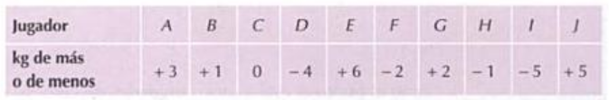 Como al preparador físico sólo le interesa saber cuántos Kilogramos de más o de menos tiene cada jugador, respecto al peso ideal decide simplificar la información en la tabla: