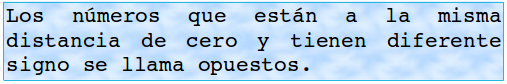 En la siguiente figura, vemos pares de números que están a la misma distancia de cero, pero poseen diferente signo. Por esa razón los llamamos números opuestos: