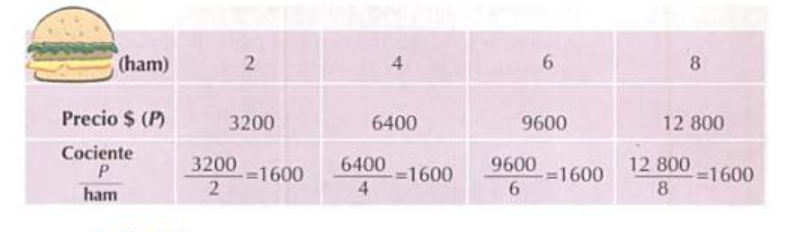 Ejemplo 1: La siguiente tabla muestra la relación entre el número de hamburguesas (ham) que el compran y el precio correspondiente. ¿Qué ley representa esta relación?