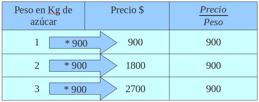 Si representamos \(Precio=P\); \(Peso=p\), entonces, tenemos: \(P=k \times p\) que se lee: “el precio es directamente proporcional al peso”.Para este caso la constante de proporcionalidad es \(900\) podemos escribir: \(P=900 \times p\)