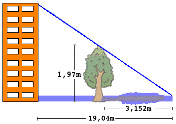 EJEMPLO 2: Un árbol de \(1,07 m\) de altura proyecta una sombra de \(3,152m\). ¿Cuál es la altura de un edificio que a la misma hora proyecta una sombra de \(19,04m\)?