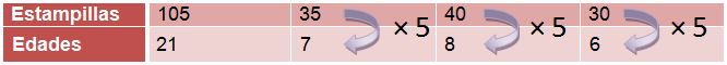 Como las \(105\) estampillas se repartirán todas, proporcionalmente, podemos establecer la siguiente proporción: