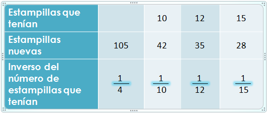 \(\frac{Inverso\ del\ No.\ de\ estampillas\ de\ un\ ni\~no}{Suma\ de\ los\ inversos de\ las\ estampillas\ que\ tiene\ cada\ uno} = \frac{No.\ de\ estampillas\ para\ ni\~no}{No.\ total\ de\ estampillas}\)