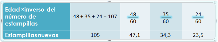 \(\frac{Edad\ de\ cada\ ni\~no}{Suma\ de\ las\ edades}= \frac{\ No.\ Estampillas\ para\ ese\ ni\~no}{No.\ Total\ de\ estampillas}\)