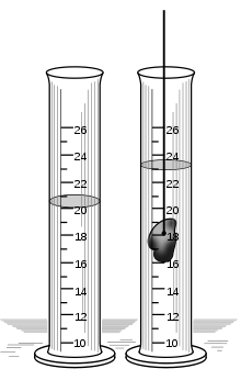 Para explicar el segundo método, consideremos un cuerpo sólido impermeable como una goma de borrar, una bolita o una piedra. Supongamos que queremos determinar el volumen de una piedra. El método es igualmente útil para cualquiera de los otros dos objetos.