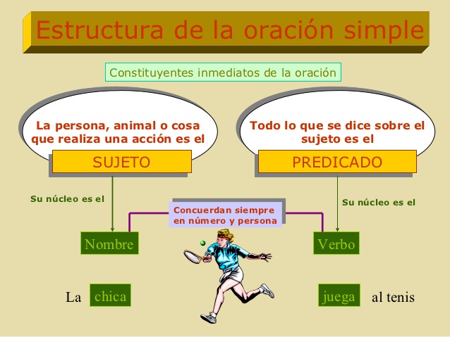 La oración es la mínima unidad del habla con sentido completo. Con el fin de poder analizarla, se ha definido en función de dos componentes; el sintagma o frase nominal (FN) y el sintagma o frase verbal (FV), en donde la primera cumple la función de sujeto y la segunda la de predicado.