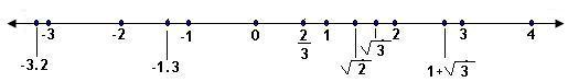 Por otra parte, si representamos sobre la recta los números reales -1.3, \(\frac{2}{3},\, 4,\, -3.2,\,\sqrt{2},\, 0\, y\, 1+\sqrt{3}\), encontramos que se hallan ubicados de izquierda a derecha así:
