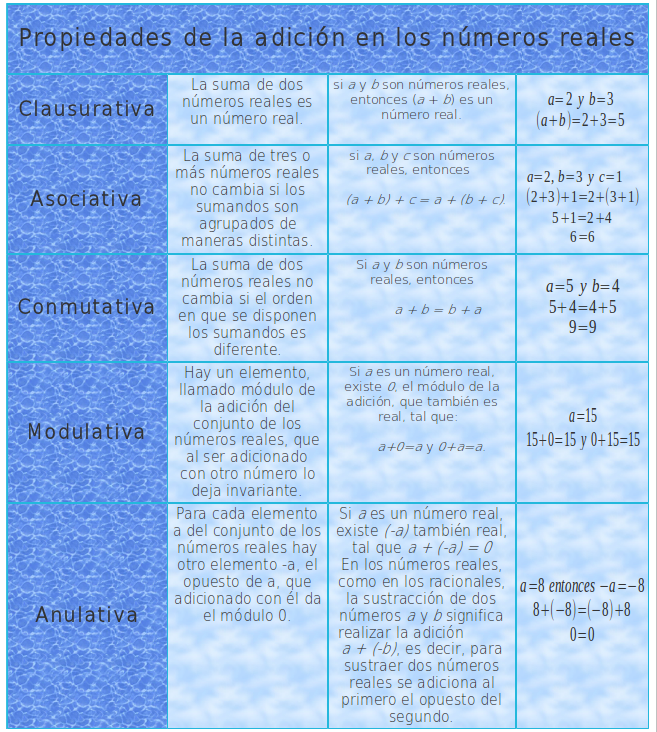 La adición en el conjunto de los números reales cumple las mismas propiedades que cumple la adición en el conjunto de los números racionales.