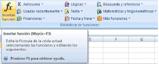 Si vemos la imágen anterior, se presentan las Funciones Usadas recientemente. Sin embargo, podríamos seleccionar otra categoría.