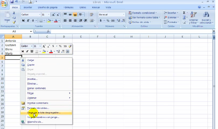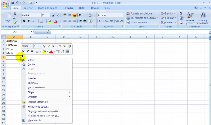 2.Nos ubicamos en la celda donde queremos colocar otro nombre, y pulsamos el botón derecho del ratón y se desplegará un menú de opciones.