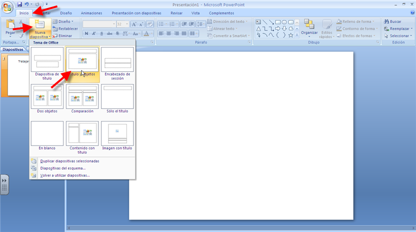 Para insertar una nueva diapositiva, el siguiente paso es dirigirnos en la pestaña de inicio y en bloque de Diapositivas hacer clic en el icono de Nueva diapositiva.