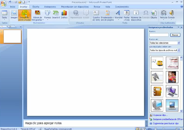 Para insertar una imágen prediseñada que se quiera incluir en una diapositiva, se realizan los siguientes pasos: