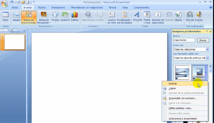 1.Nos ubicamos en la pestaña de Insertar y hacemos clic en la opción Insertar imágenes prediseñadas.