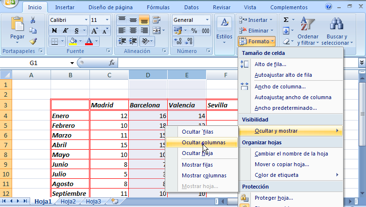 2.Luego nos dirigimos al bloque de celdas y hacemos clic en ocultar y mostrar y seleccionamos la opción ocultar columnas (D, E ,G).
