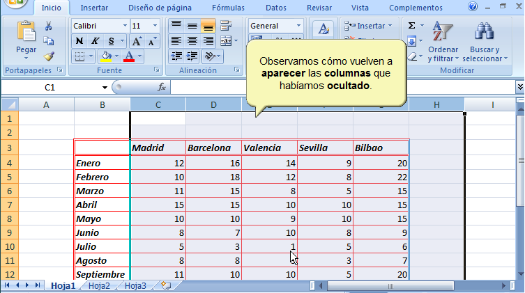Y las columnas ocultas se podrán visualizar de nuevo.