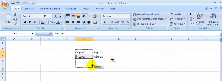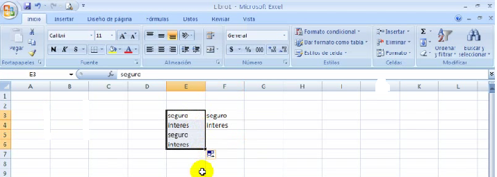 1.Sombreamos las pálabras y manteniendo el botón izquierdo del ratón apretado, ponemos el cursor en la esquina inferior derecha de las dos pálabras y arrastramos hacia abajo hasta donde queremos copiar.