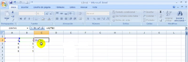 Tenemos dos columnas de números, y deseamos tener en la tercera columna la multiplicación de las dos cifras de las columnas contiguas. En vez de realizar la multiplicación las veces que sea requerido, podemos copiar a partir de la fórmula escrita una sola vez