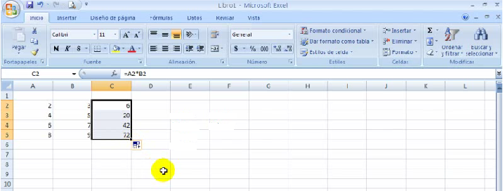 2.Una vez tenemos el resultado ubicado en la columna C2 para este ejemplo. Con el cursor nos ubicamos en la parte inferior derecha de la celda que vamos a copiar y arrastramos hacia abajo hasta donde queremos calcular la multiplicación.