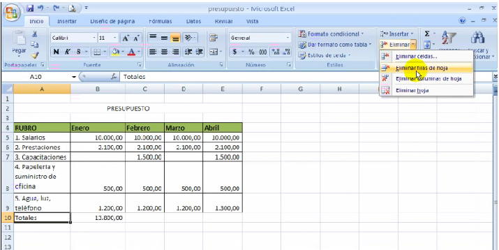 1.2.En este caso del ejemplo seleccionamos Eliminar filas de hoja y ya se habrá borrado de nuestra hoja de trabajo el contenido de la fila 10 .