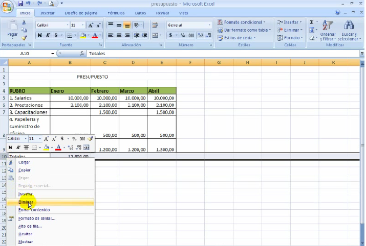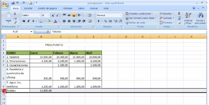 1.Nos ubicamos en una de las celdas que pertenecen a la fila que deseamos eliminar. Por ejemplo si queremos borrar la fila 10, nos posicionamos en la celda A10 .